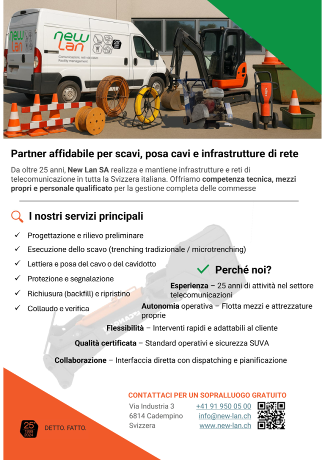 Da oltre 25 anni, New Lan SA realizza scavi e posa infrastrutture di telecomunicazioni con mezzi propri e personale qualificato.