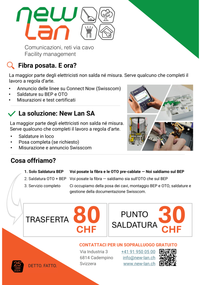 New Lan SA completa il lavoro con saldature professionali, posatura su BEP/OTO e annunci ufficiali su Connect Now (Swisscom).